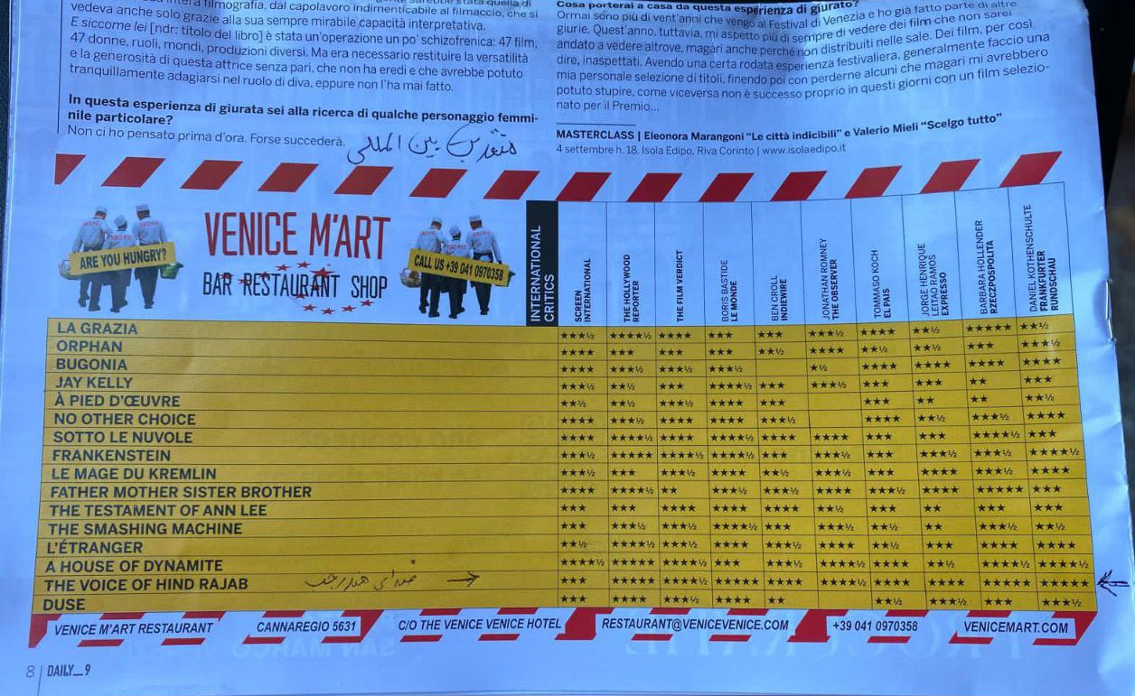 همچنین در جدول ارزشگذاری منتقدین ایتالیایی بهطور جداگانه هم این فیلم بالاترین امتیاز که ۴٫۱ از پنج ستاره است را به خود اختصاص داده است و نقدهای نوشته شده در مطبوعات نیز از این اثر ستایش کردهاند. حال باید دید ۳ فیلم باقیمانده مسابقه میتوانند از نظر امتیازات، بر این فیلم برتری پیدا کنند؟